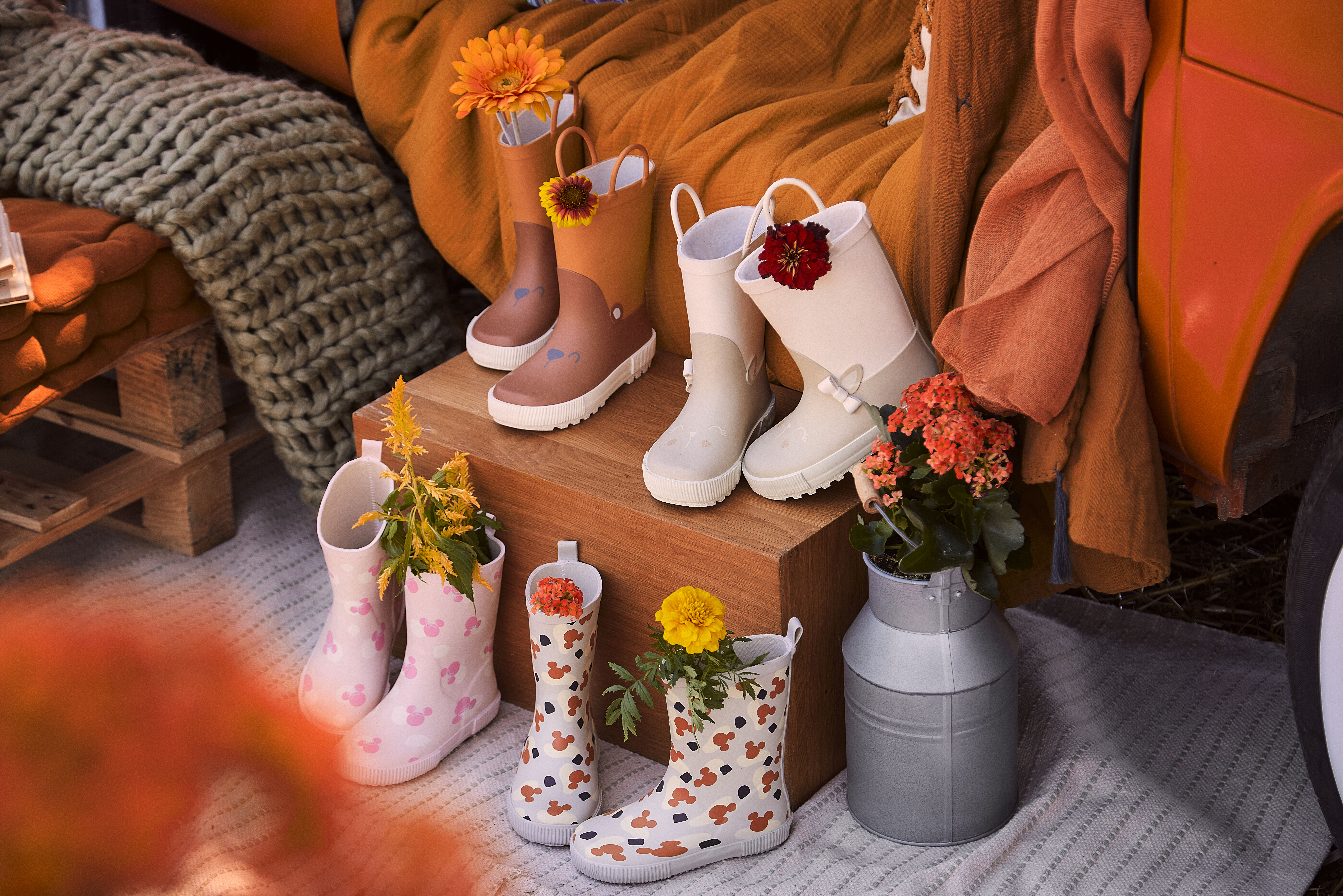 Οι πολύχρωμες μπότες της Orchestra, όπως τα μοντέλα με τυπώματα της Minnie Disney ή οι μπότες με μοτίβα λαγουδάκι, μετατρέπουν τον πρακτικό εξοπλισμό σε παιχνιδιάρικο αξεσουάρ. Στα παιδιά αρέσει να βλέπουν τα πόδια τους να κάνουν το νερό να πιτσιλίζει, και οι μπότες με οικεία χαρακτήρες μεγεθύνουν αυτό το θέαμα.